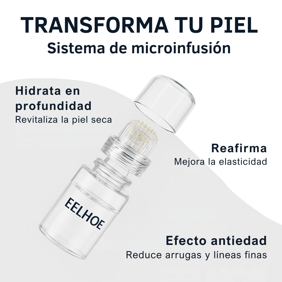 Presione suavemente para que las microagujas del aplicador distribuyan el suero de manera uniforme en toda la piel de su rostro, cuello y labios.